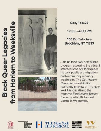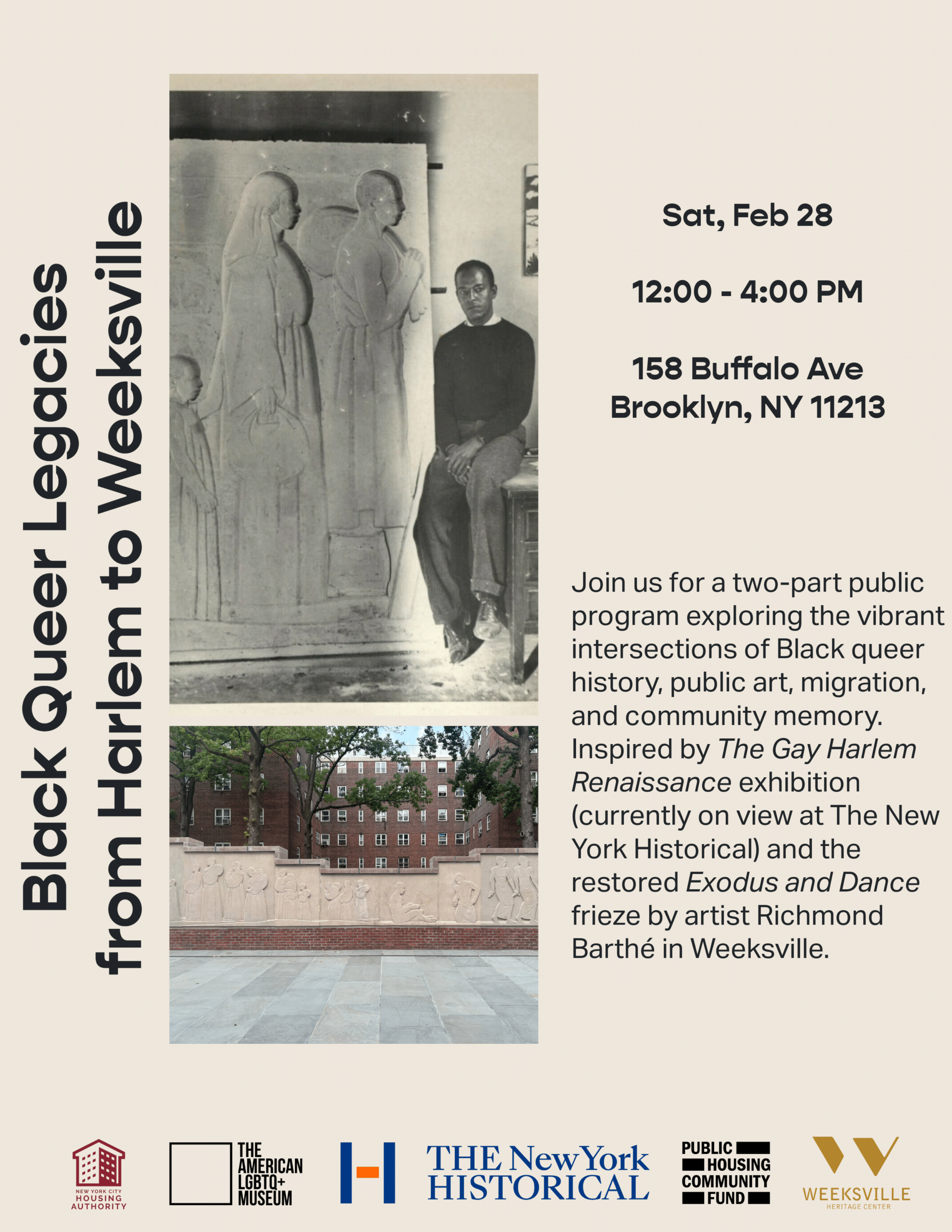 Inspired by The Gay Harlem Renaissance exhibition (currently on view at The New York Historical) and the restored Exodus and Dance frieze by artist Richmond Barthé in Weeksville, we’ll trace the creative and cultural lineages that connect Harlem’s early 20th-century queer artists to the living histories of present-day Brooklyn.